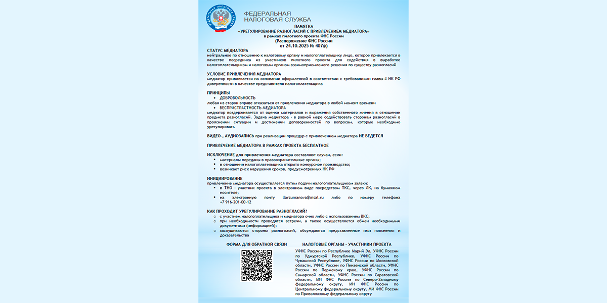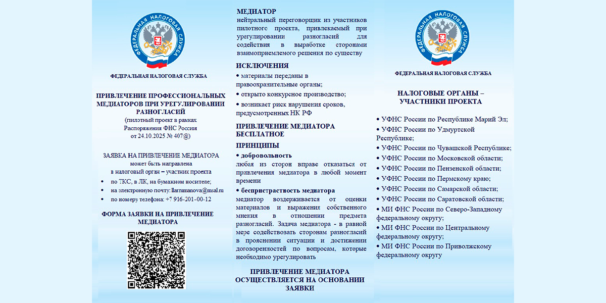 Межрайонная ИФНС России № 6 по Московской области является одним из участников пилотного проекта по урегулированию налоговых разногласий с помощью профессиональных медиаторов в соответствии с Распоряжением ФНС России от 24.10.2025 № 407@ «О проведении пилотного проекта по привлечению медиаторов при урегулировании разногласий, возникающих в налоговых правоотношениях».