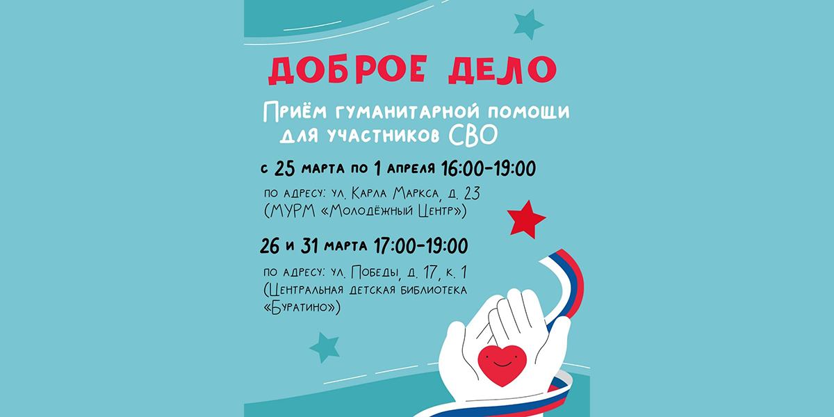 Приём гуманитарной помощи будет проводиться с 16:00 до 19:00 по адресу: ул. Карла Маркса, д. 23.