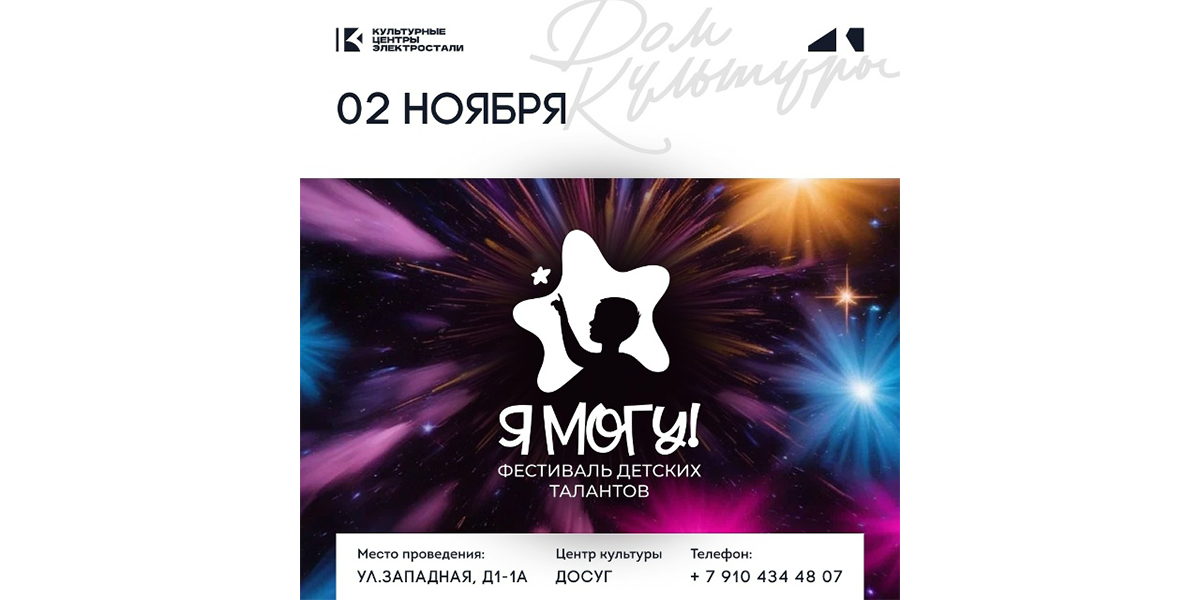 2 ноября в Центре культуры «Досуг» состоится праздник детского творчества! Приглашаем юных талантов в возрасте от 3 до 8 лет показать свои способности.