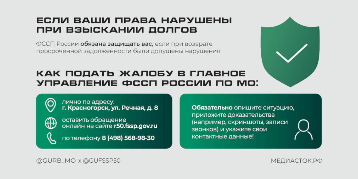 В целях информирования граждан о защите их законных прав и интересов при взаимодействии с кредиторами и коллекторскими организациями при возврате просроченной задолженности разъясняем, как подать жалобу в Главное управление ФСПП России по Московской области.