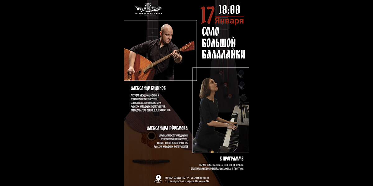 Преподаватель школы, лауреат Международных и Всероссийских конкурсов, солист Молодёжного оркестра русских народных инструментов Александр Кудинов исполнит как хорошо знакомые и любимые обработки русских народных песен, так и современные оригинальные произведения для балалайки-контрабас.
