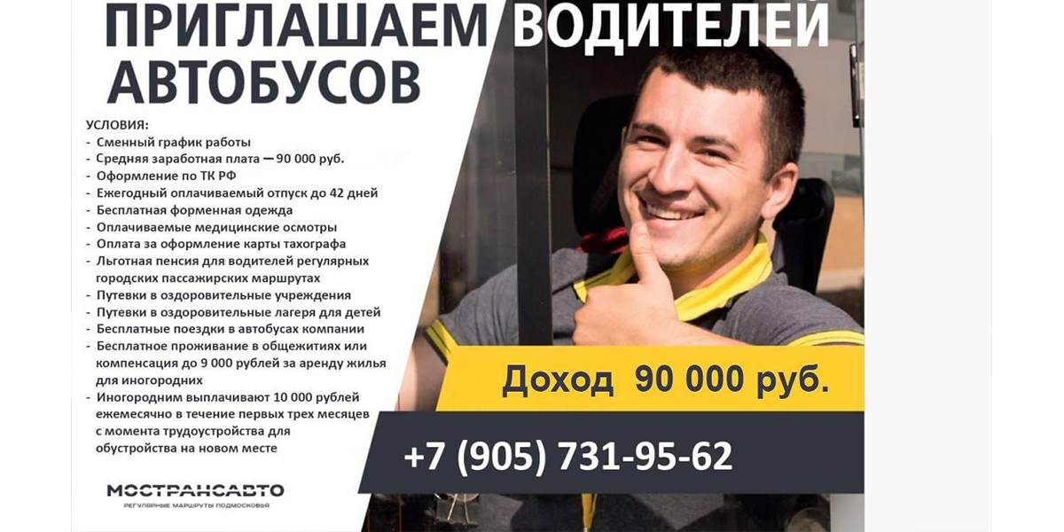 «МАП 12 г. Ногинск» филиал АО «МОСТРАНСАВТО» приглашает на работу водителей автобусов
