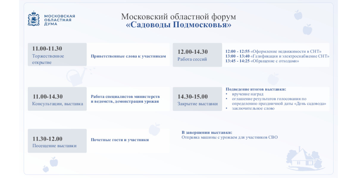 Московская областная Дума запланировала проведение Московского областного форума «Садоводы Подмосковья», на котором собирается обсудить меры государственной и муниципальной поддержки ведения садоводства и огородничества на территории Московской области, а также актуальные проблемы садоводческих или огороднических некоммерческих товариществ и пути их решения.