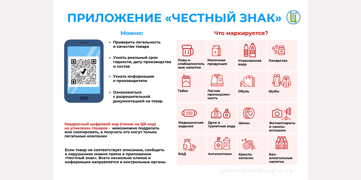На упаковках товаров покупатели видят квадратный цифровой код, аналогичный QR-коду. Этот уникальный идентификатор невозможно подделать или воспроизвести, его получают только легальные производители. Сканировав код через бесплатное приложение «Честный знак» на смартфоне, можно проверить легальность товара, его качество, срок годности, дату производства и информацию о производителе. Также можно ознакомиться с разрешительной документацией на товар.