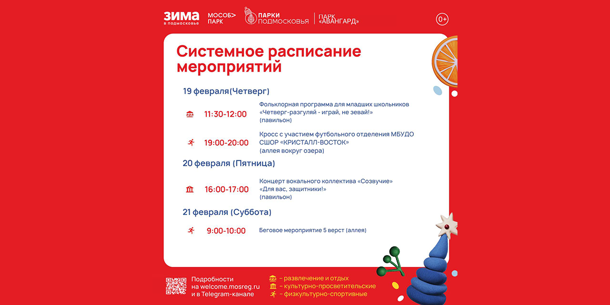 В пятницу, 20 февраля, в павильоне парка будет проведен предпраздничный концерт вокального коллектива «Созвучие» — «Для вас, защитники!», приуроченный к Дню защитника Отечества.
