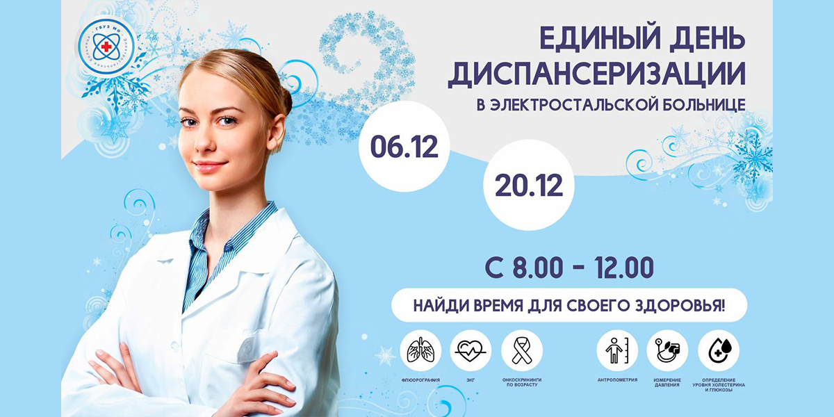 6 декабря с 08:00 до 12:00 жители города смогут пройти комплекс обследований по программе диспансеризации в одном удобном месте по адресу: поликлиника Электростальской больницы, ул. Пушкина, дом 3. В рамках программы Вы сможете пройти необходимые обследования, включая общий анализ крови, проверку уровня сахара и холестерина, электрокардиограмму, флюорографию и осмотр врача-терапевта. Все процедуры будут организованы в одном месте для вашего удобства. Приглашаем жителей города пройти обследование и позаботиться о своём здоровье.