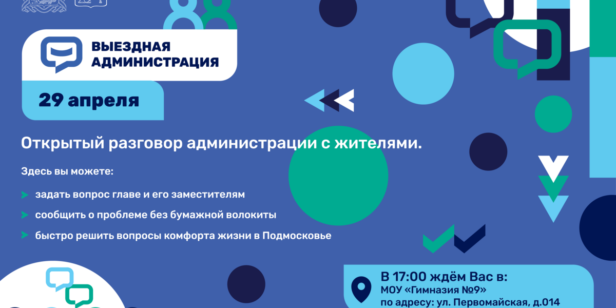 Жители городского округа приглашаются на выездную администрацию, которая пройдёт 29 апреля в 17:00 в гимназии № 9 по адресу: ул. Первомайская, д. 014.