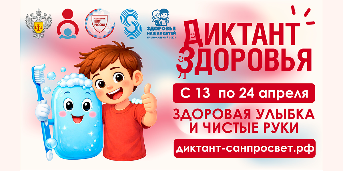 С 13 по 24 апреля 2026 года Роспотребнадзор запускает первый тематический трек Всероссийской санитарно-просветительской акции «Диктант здоровья» — «Здоровая улыбка и чистые руки». Модератором проекта выступает ФБУН «Новосибирский НИИ гигиены» Роспотребнадзора.