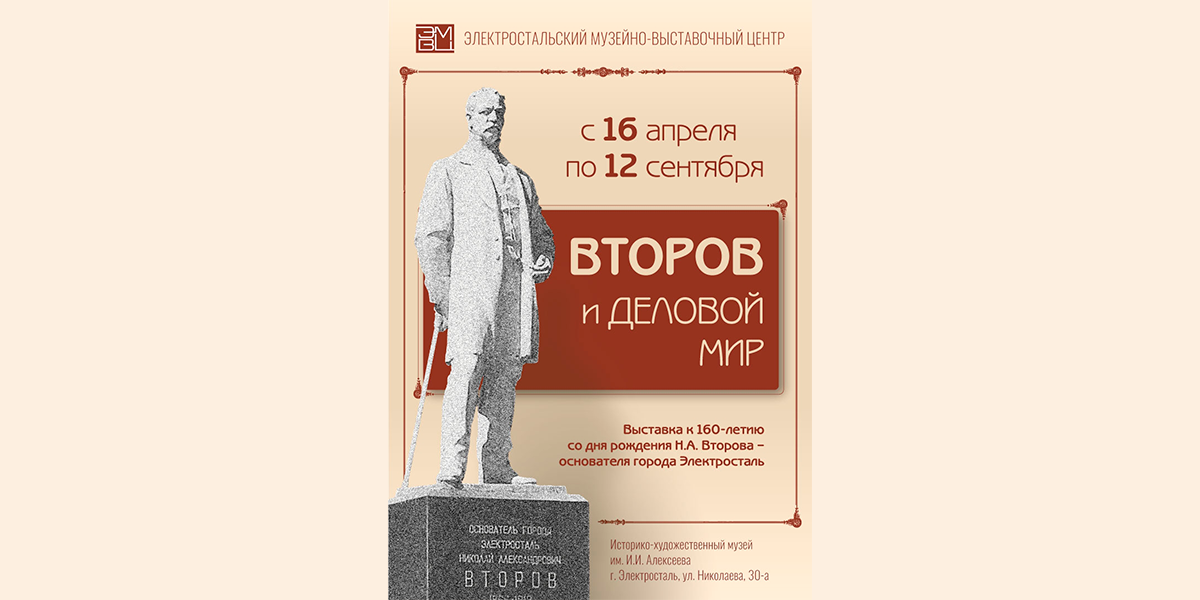 С 16 апреля по 12 сентября в Историко-художественном музее им. И.И. Алексеева пройдёт выставка «Второв и деловой мир», приуроченная к 160-летию основателя Электростали Николая Александровича Второва.