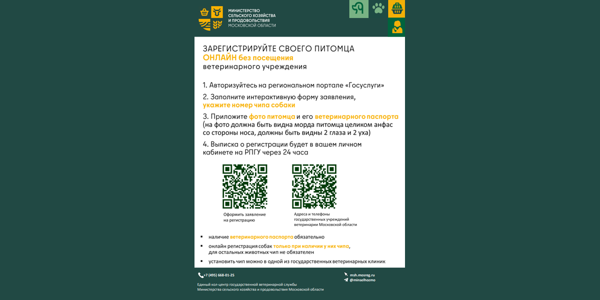 Министерство сельского хозяйства и продовольствия Московской области сообщает, что меняется для владельцев животных. Теперь вся процедура регистрации проводится дистанционно через Портал государственных и муниципальных услуг Московской области. Это позволяет экономить время и силы владельцам. Зарегистрировать животных теперь могут не только граждане, но и различные организации: питомники, садоводческие товарищества (СНТ), гаражные кооперативы, предприятия и индивидуальные предприниматели.