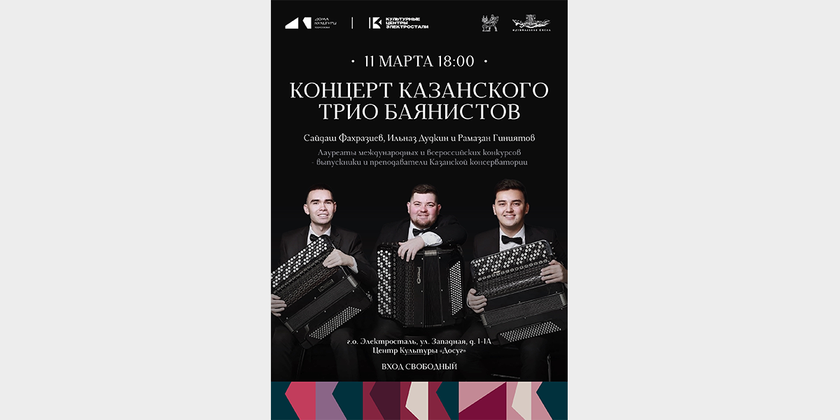 На сцене Центра культуры «Досуг» 11 марта выступит трио баянистов — музыканты, которые умеют превращать каждый аккорд в историю, наполненную энергией, вдохновением и душевным теплом.