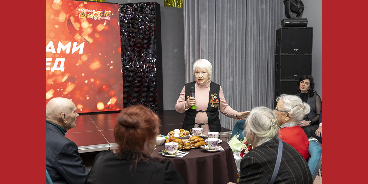 За столиками собрались представители администрации, депутаты городского Совета депутатов, председатель клуба «Дорогами Побед» Валентина Ефимовна Юртаева, представители Электростальской городской общественной организации бывших несовершеннолетних узников фашизма, члены общественной организации «Блокадники Ленинграда», Труженики тыла, Дети войны, совет ветеранов города, ветераны сферы образования, ветераны боевых действий, студенты Электростальского колледжа.